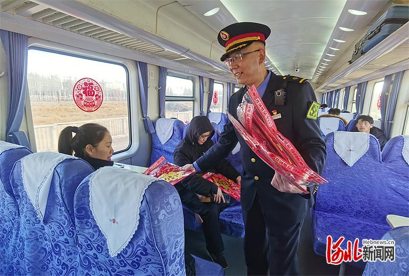 2月16日,在“太行老区号”上,列车长田源给游客们施济“福”字等新春礼包。河北日报记者 陈 正摄