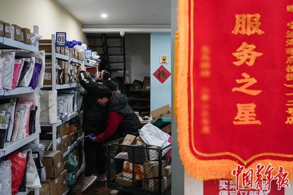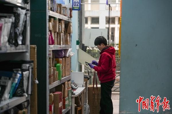 女儿和同伴去送货后,熊丽独安详快递驿站盘货货品。