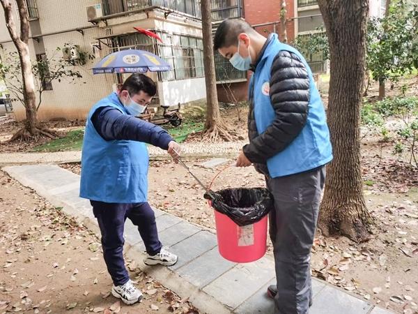 武汉“好意思好家园”的年青东谈主在小区里作念清扫。受访者供图